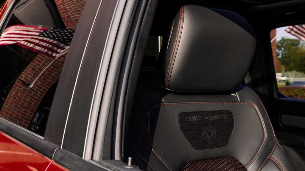 Griglia in tinta con la carrozzeria con inserto in rete nera e stemma “RAM”, vernice esterna bicolore e ganci di traino neri.